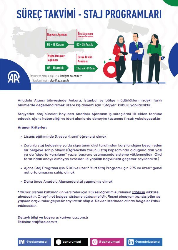 Stajyerler, staj süreleri boyunca Anadolu Ajansının iÅŸ süreçlerini ilk elden tecrübe edecek, ajans