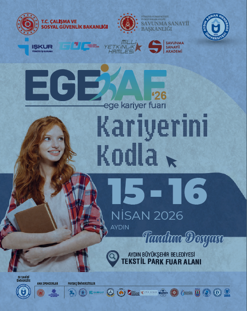 Çalışma ve Sosyal Güvenlik Bakanlığı Türkiye İş Kurumu (İŞKUR) Genel MüdürlüÄŸü koordinasyonunda, Aydın Adnan Menderes Üniversitesi ev sahipliÄŸinde düzenlenecek olan EGEKAF'26 (Ege Kariyer Fuarı), 15-16 Nisan 2026 tarihlerinde Aydın Tekstil Park Fuar Alanı'nda gerçekleÅŸtirilecektir.