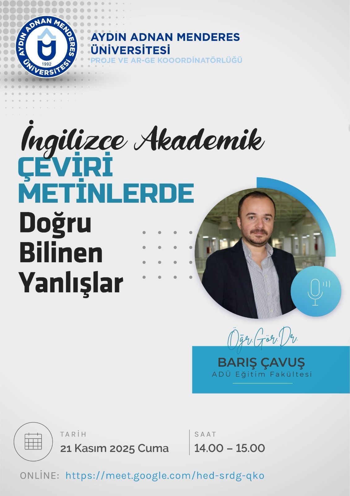 21 Kasım 2025 Cuma günü Google Meet platformu üzerinden düzenlenen etkinlikte, Aydın Adnan Menderes Üniversitesi Eğitim Fakültesi öğretim elemanlarından Öğr. Gör. Dr. Barış ÇAVUŞ konuşmacı olarak yer aldı. Etkinliğe üniversitemiz akademik personeli ile lisansüstü öğrencilerimiz yoğun ilgi gösterdi.