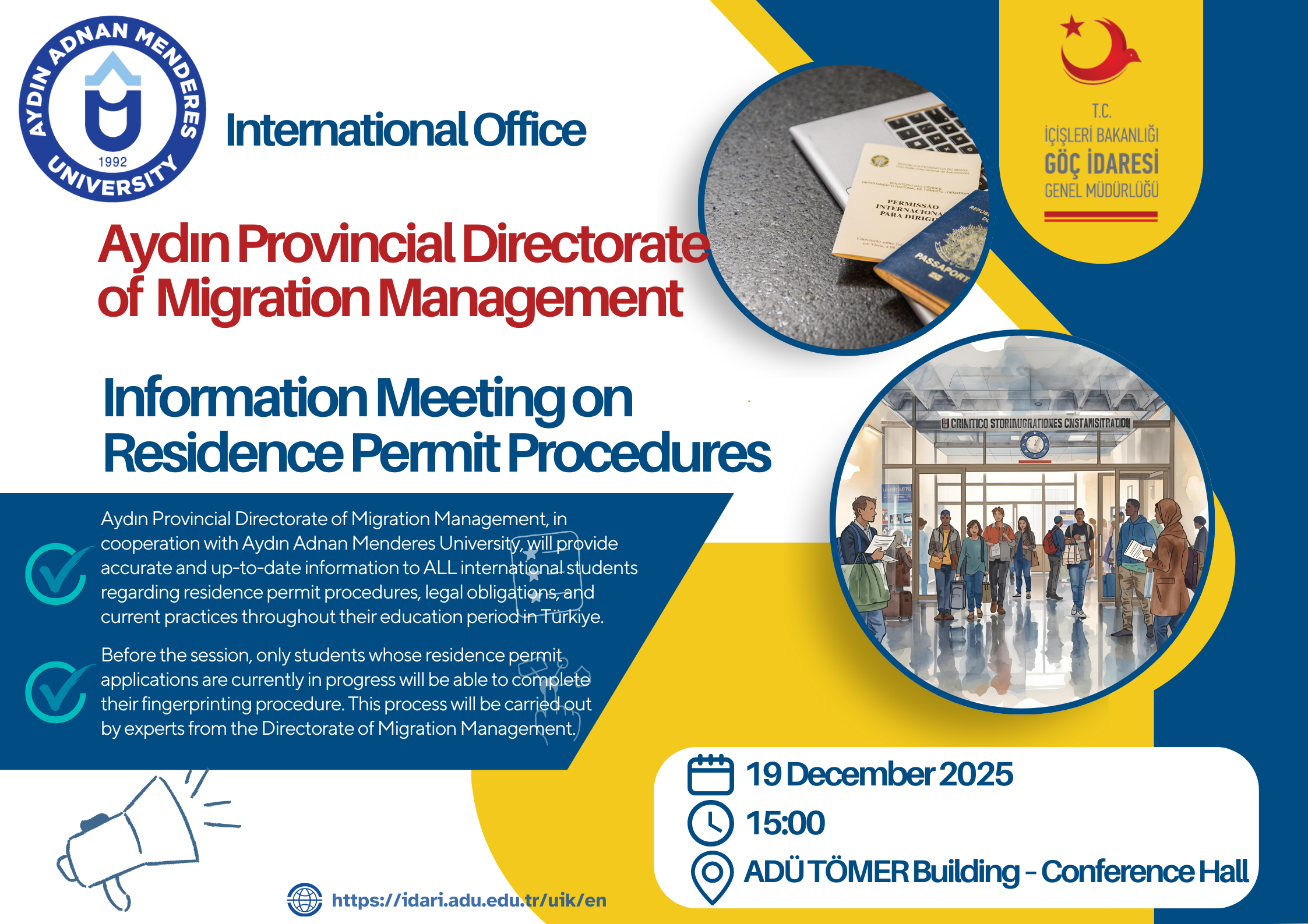 Aydın İl Göç İdaresi Müdürlüğü ile Aydın Adnan Menderes Üniversitesi iş birliğinde, uluslararası öğrenciler için ikamet izni süreçleri hakkında bilgilendirme toplantısı düzenlenecektir.