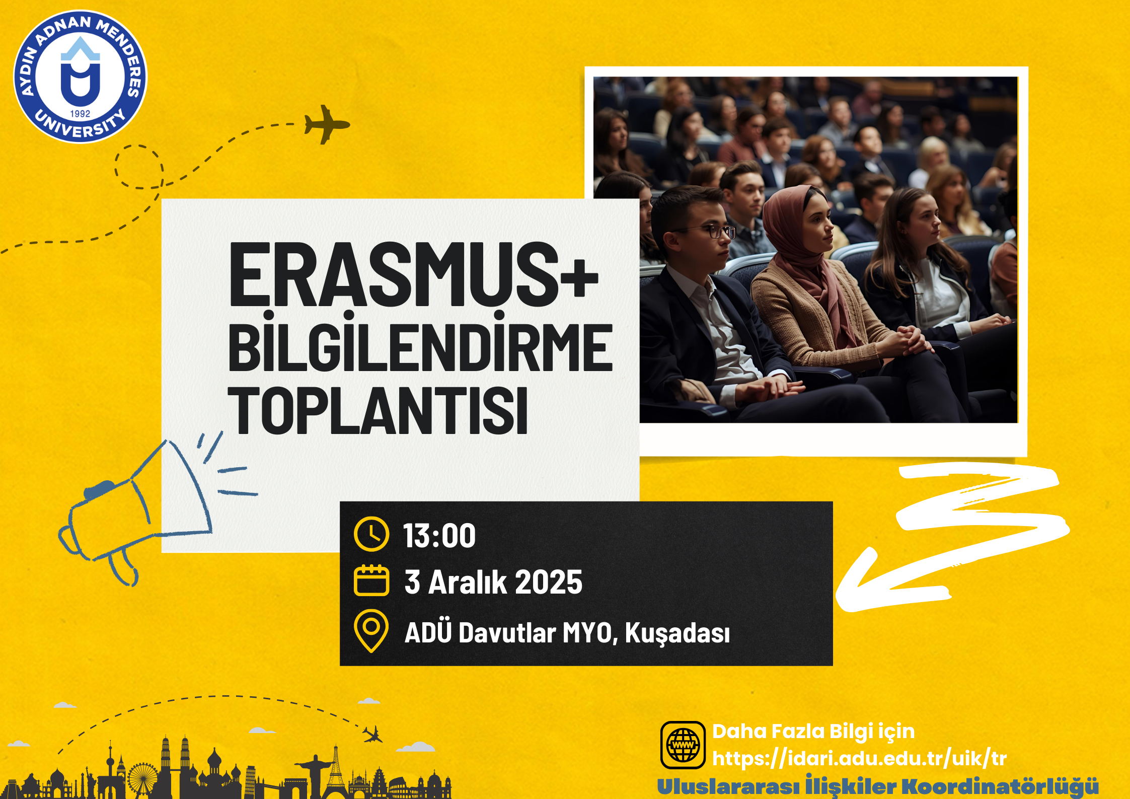 Uluslararası İlişkiler Koordinatörlüğü tarafından, Aydın Adnan Menderes Üniversitesi Davutlar Meslek Yüksekokulu öğrencilerine yönelik Erasmus Bilgilendirme Toplantısı düzenlenecektir.